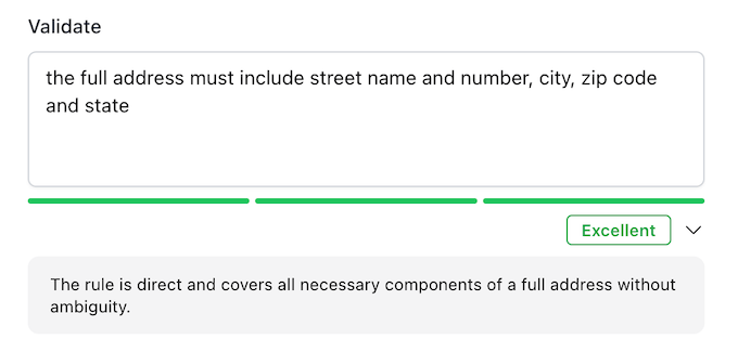 Now if we type in “the full address must include street name and number, city, zip code and state,” the AI Analyzer tells us “The rule is direct and covers all necessary components of a full address without ambiguity.” We’re good to go!