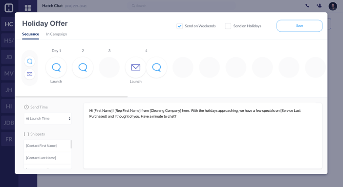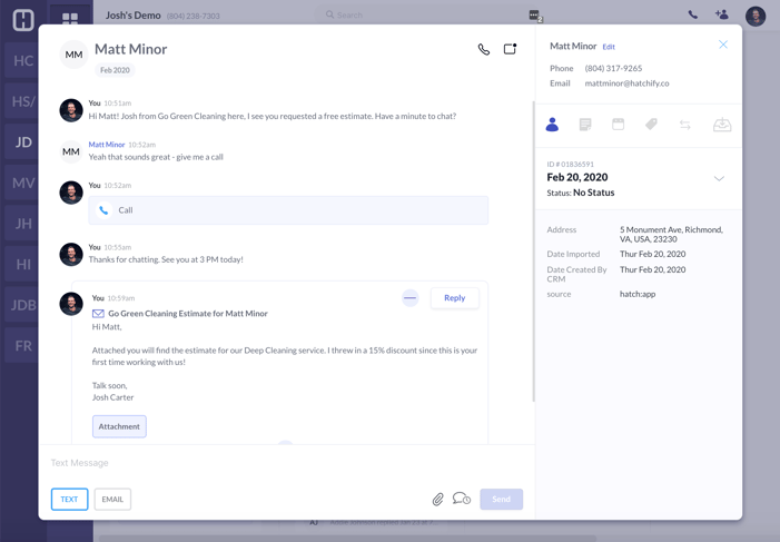 Hatch has found that cleaning companies see a 64% average response rate over text. Compare that to 4.5% over email and you see why layering in texting is helping reps crush their close rates.