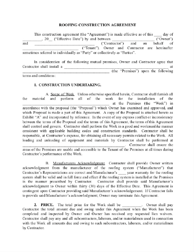 TemplateLab offers several different roofing contract templates in Word Doc form. If you don’t have Word, don’t worry! Download the file and then open a new Google doc. Go to file > Open > upload and upload the file there.