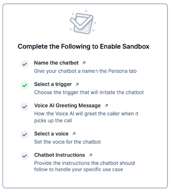 - Guided experience. When building out an AI bot, you will now see a checklist on the right hand side of the bot builder, of what you need to do in order to begin interacting with the bot. You can click on the arrow for each step to complete that step.