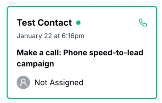 When a phone call step is triggered, the contact card appears on your sales board with a green outline. The card shows a clear prompt to call the contact, and includes key details like opportunity data, contact history, and campaign name. This way you'll have all the context you need for a successful call.