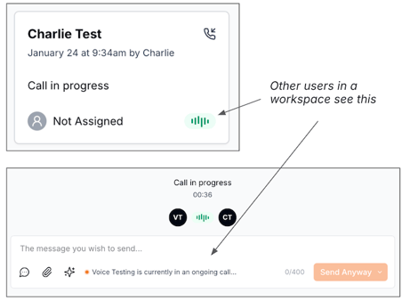 Once you click into the card, you can make the call right within Hatch. When a phone call is happening, others can see it.