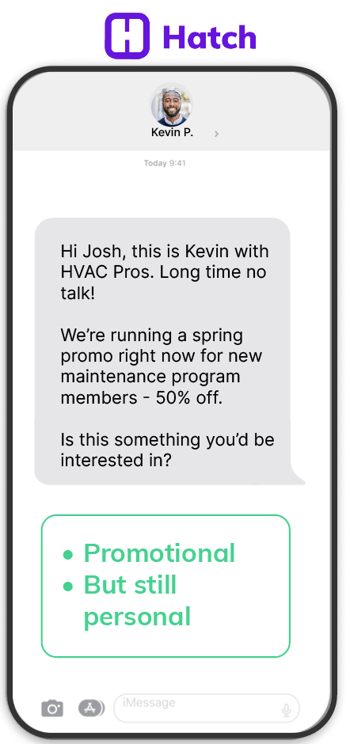 You can use Hatch for promo texts and marketing, and on top of that, you can make them more personalized and one-to-one.