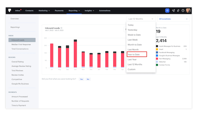 Podium's reporting is tied directly to its use cases: receiving inbound messages, improving reputation, and collecting payments. You can customize your date range and also view conversations by source (webchat, contact form, Facebook, email, etc.). Metrics include: