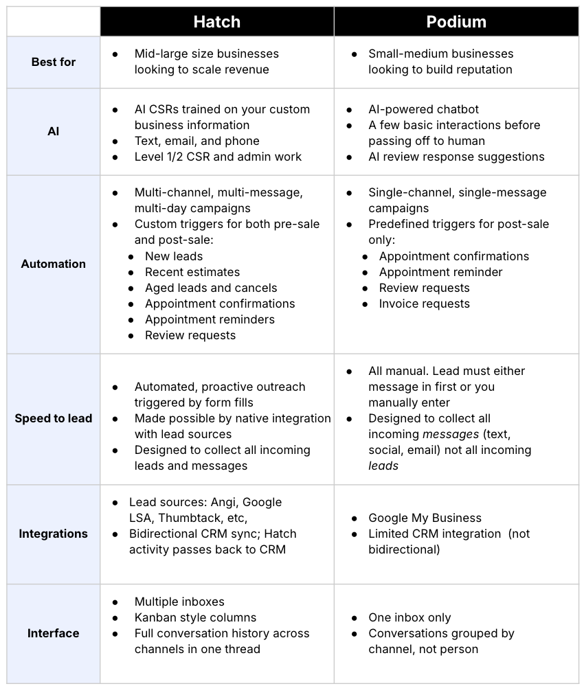 • Podium is good for scaling transactional exchanges, like sharing promotions, sending review links, and processing payments. Hatch is good for scaling 1:1, conversion-focused conversations, like reaching out to book an appointment, following up on an estimates, and nurturing leads and customers.