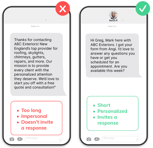 1. Personalized: Reach out using names and provide context. “Hi Greg, Mark here with ABC Exteriors. I got your form from Angi. I’d love to answer any questions you have or get you scheduled for an appointment. Are you available this week?