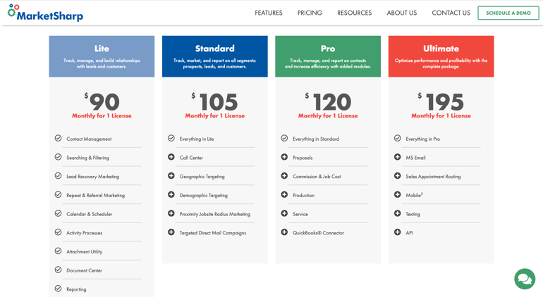 Marketsharp (Pricing from November 2020) offers a monthly rate primarily based on features and licenses. They offer discounts for additional licenses as business grows.