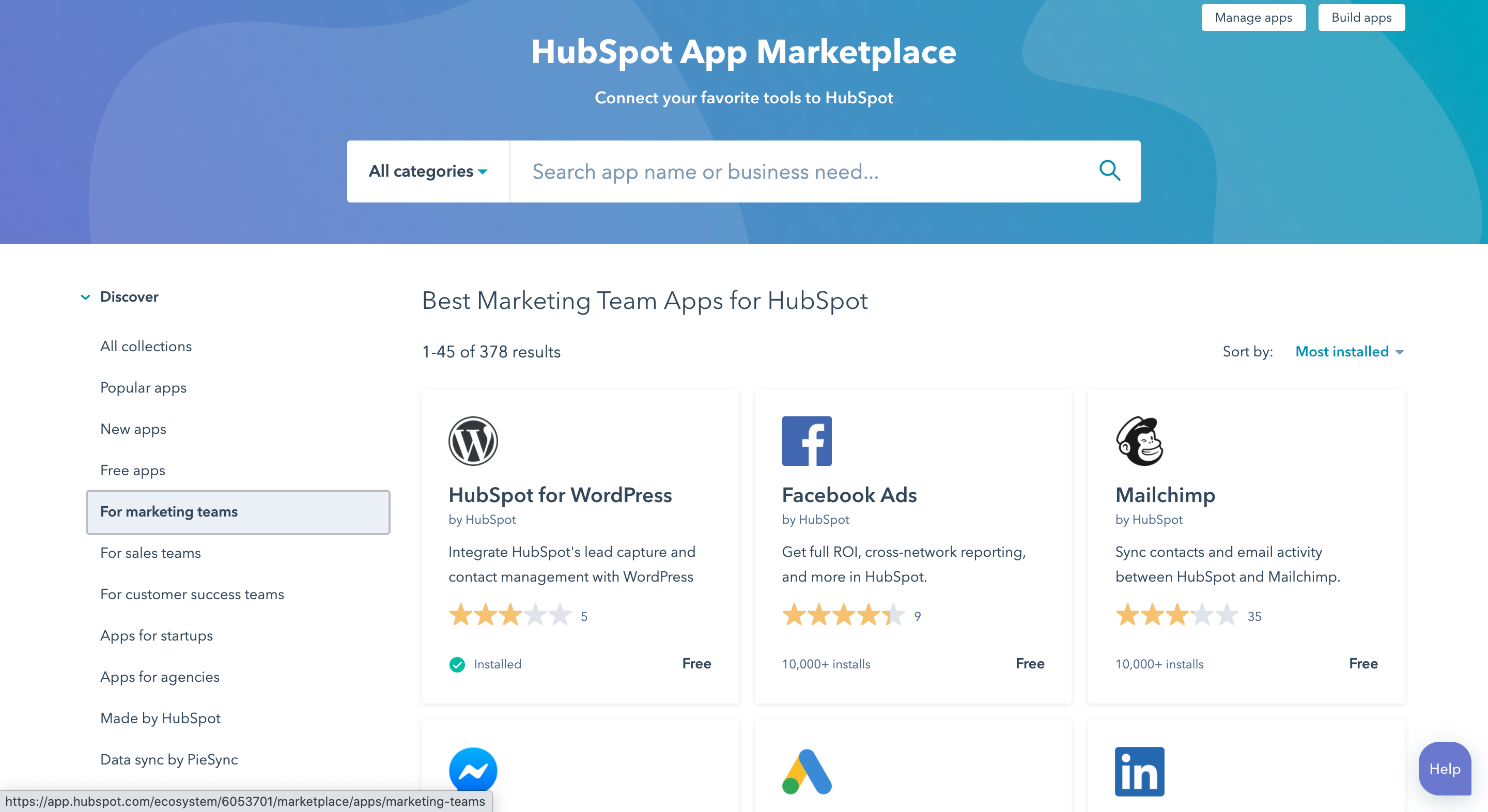 Hubspot's App Marketplace allows teams to easily get their sales and marketing ecosystem set up. From here, Hubspot users can add things like Lead Sources, Email Marketing Platforms, and more.