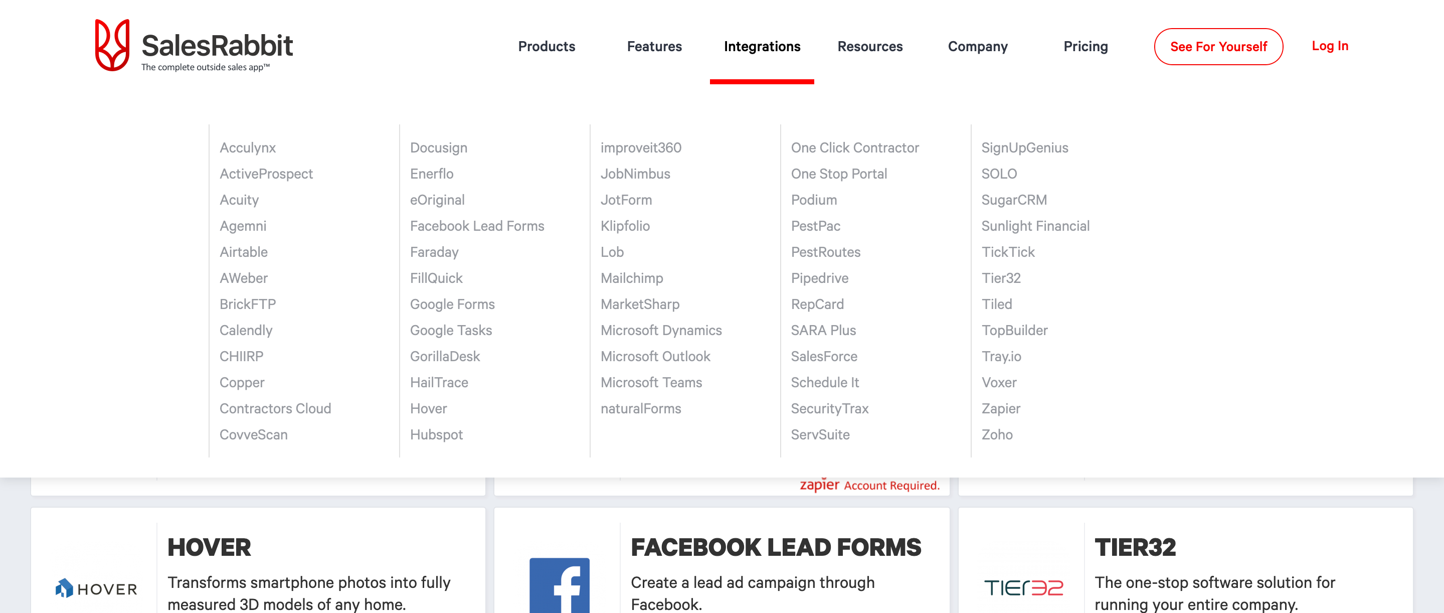 Outside Sales App SalesRabbit provides a list of their integrations and what they look like directly on their website. Find examples of how a potential CRM would set up an integration with products your business already works with.