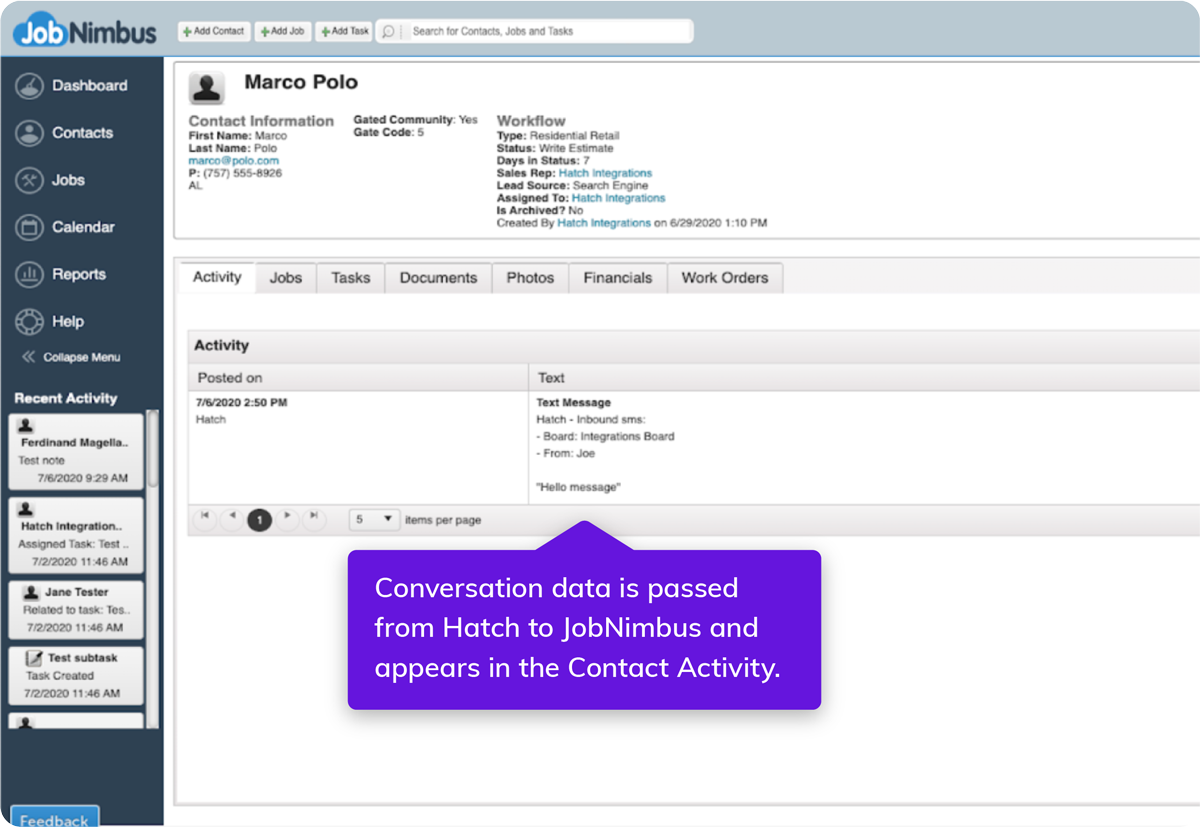 Hatch Communications such as a call, text, or email is recorded in JobNimbus Contact or Job Notes.