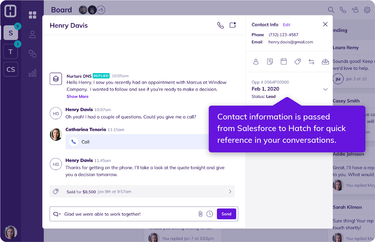 Your Hatch board becomes your inbox for every type of interaction you have with prospects and customers. Create and manage all text, email and phone conversations in one clean dashboard.