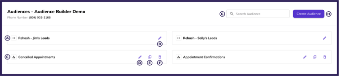 G: Search Bar. The search bar allows the user to search by Audience Name to narrow down the Audiences that are displayed.
