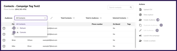 B: Edit Button. HQL Audiences only have an edit option available on this page. Clicking it will navigate to the query editor for the selected Audience on the Contacts Page.