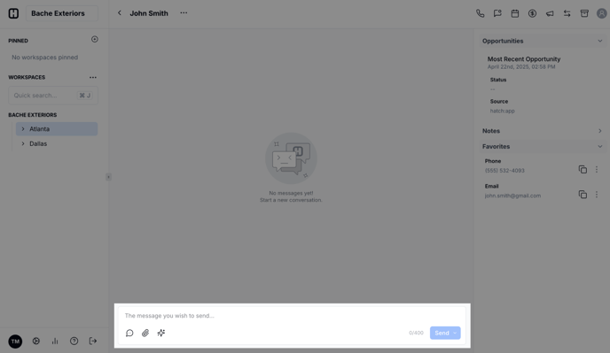 - Change contact method: The first symbol shows which medium you're using to communicate with this contact. By default, your responses in Hatch will come from whichever medium your contact has used to contact you, but you can also switch in the middle of a conversation. A speech bubble means you're drafting a SMS message, a mail icon means you're writing an email, and the Yelp logo means you're going to send a message via Yelp.