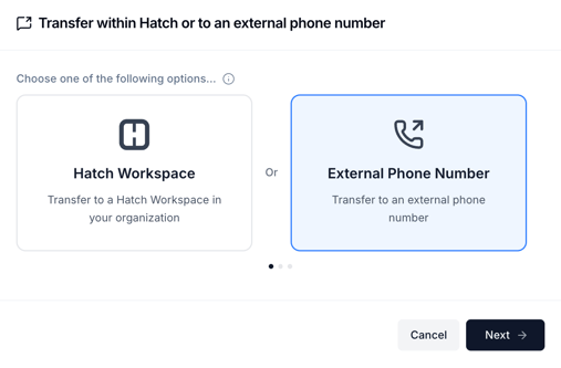 Once you add this command into your AI Agent Instructions, you'll be able to choose one of two live transfer types: to the external phone number of your choosing, or a live transfer within Hatch.