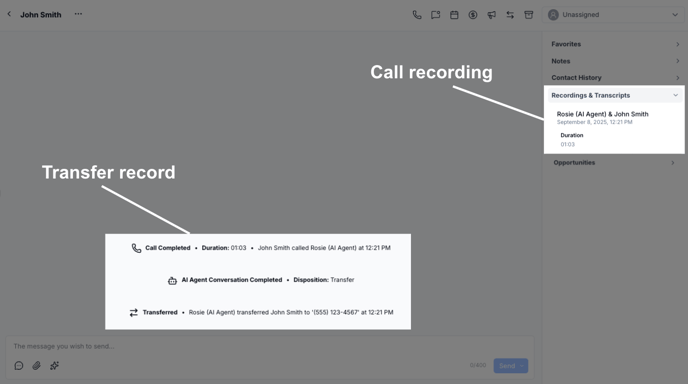 - The contact card will appear at the top of the inbox column, and will show a record of which bot transferred the contact, as well as which workspace the contact was transferred from (if relevant). A recording of the first leg of the conversation will also be available in the side bar.
