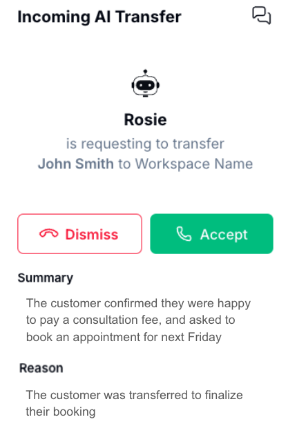 Step one: A customer calls your Hatch phone number, and triggers the /transfercommand. The situation you've told the Voice AI to look out for and transfer the call, occurs in this first leg of the call. Whatever transfer instructions have been added for the agent occurs now—the agent will say "I'll transfer you now" or similar.- Step two: An inbound call notification appears in whichever Hatch workspace has been designated as the one to receive the transfer. You'll see a short summary of what happened on the first leg of the call, and can pick up the call to start speaking to the contact immediately.