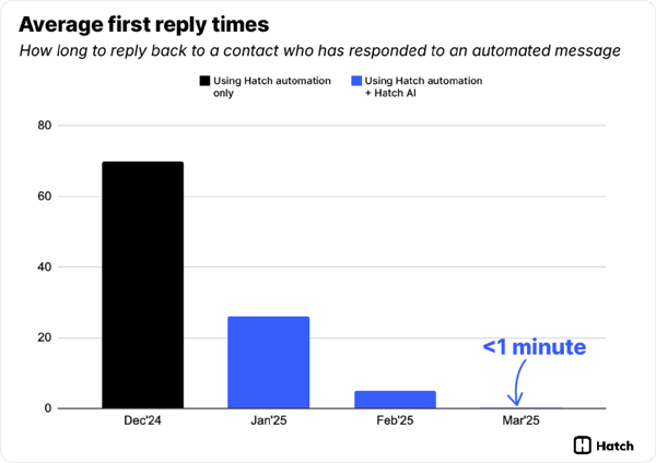 With traditional Hatch, as soon as a contact responds to the automated outreach, a human rep will jump in and conduct the conversation. With Hatch AI, a conversational AI agent jumps in and handles the “stage I” responsibilities like answering their questions and asking questions to qualify them.