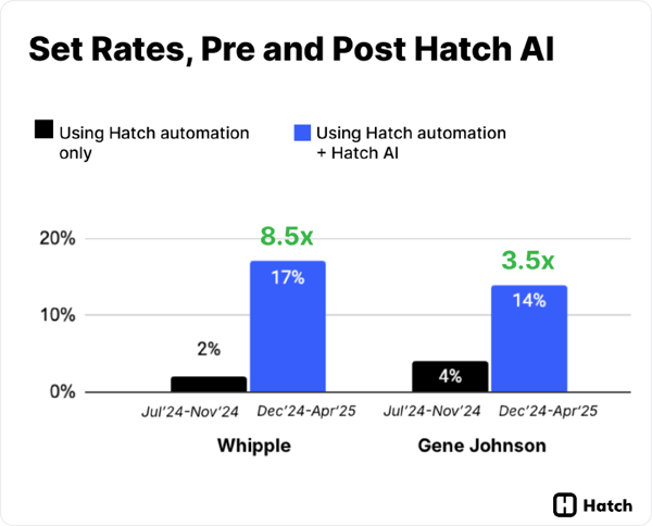 The below chart shows set rates for three Apex brands, comparing their set rates using Hatch automation only vs using Hatch automation plus AI.