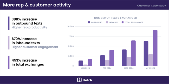 This customer had been using Hatch for a year to instantly engage leads. With automation and adding text as a communication channel, they were seeing 40-45% response rates—four times higher than the 10-15% they were seeing when using phone only.