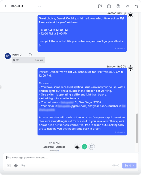 With the ServiceTitan calendar integration, Point Loma’s bots are also set up to book appointments, as you can see below.