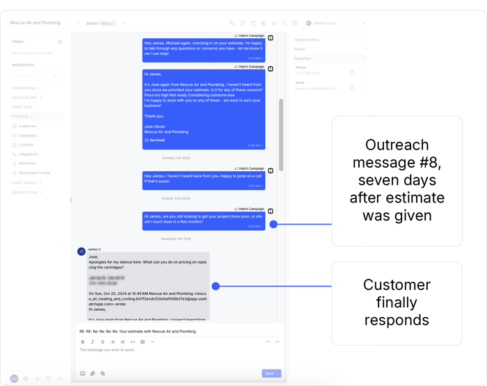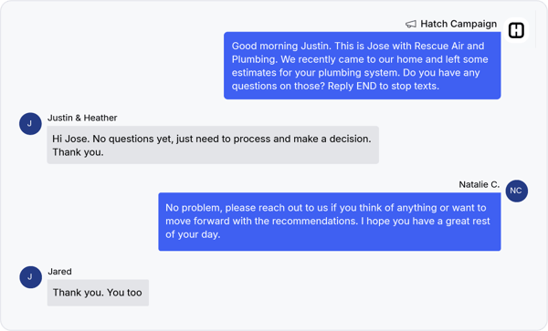Rescue Air’s biggest use-case with Hatch is sales follow-up. Once a tech goes out and leaves behind an estimate, they have a certain amount of time to follow-up manually with the customer. Once that time window has passed, their Hatch campaign automatically reaches out. “It’s just like a happy call. We ask them how everything went, just to re-engage them,” Michael explained. This starts the conversation where they can obtain feedback, surface objections, and eventually lead to a sale.